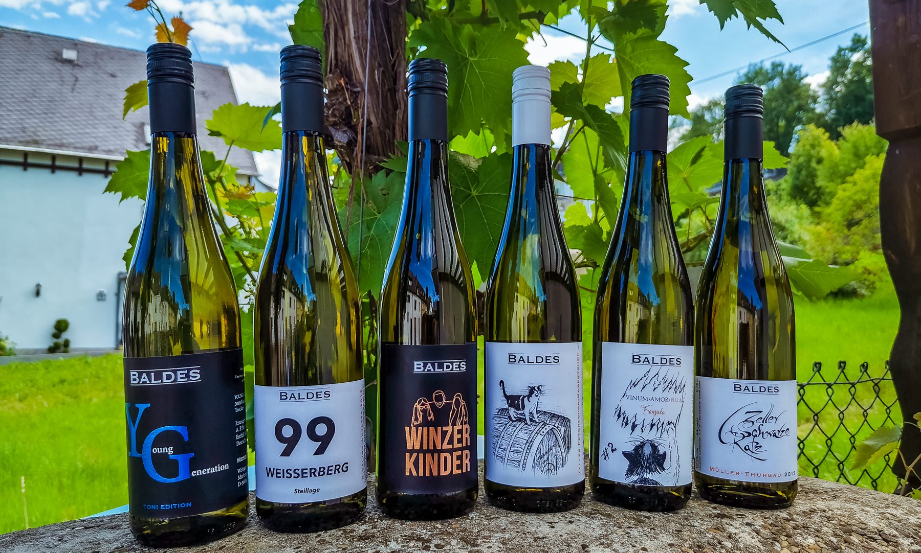 Seit 2016 sorgen die beiden Töchter Franziska und Lydia der Familie Baldes, sowie deren Mann Maximilian Franzen, mit ihren “Young Generation Weinen” für frischen Wind im Weingut. Durch Maximilian wurden wieder die Rieslinge aus der Steillage fokussiert. Er selbst stammt aus einem Traditionsweingut in Bremm an der Mosel und verbrachte seine Kindheit in den wohl steilsten Weinlagen Europas, dem Bremmer Calmont. Von seinen Eltern, Iris und Ulrich Franzen, hat er die Leidenschaft zu den Moselsteillagen wohl einfach im Blut. Besonders die Ursprungslage der Zeller Schwarzen Katz “das Zeller Petersborn Kabertchen” sind das Herzensprojekt von Lydia und Maximilian, die sie in der Kollektion #Franzen1 #Franzen2 und #Franzen3 kreiert haben. Aber auch die jüngste im Familienbetrieb, Franziska Baldes, hat mit ihrem Wein ‘Vinum Amor Filia’ ihre ganz eigene Idee von einem “Zeller schwarze Katz” Riesling in die Flasche gefüllt.