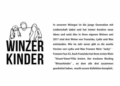 Besonders erfrischend ist der Winzerkinder, ein Wein, bei dem alle drei Winzerkinder ihre jungen Erfahrungen und Ideen einfließen ließen. Inzwischen gibt es ihn von mehreren Jahrgängen.
